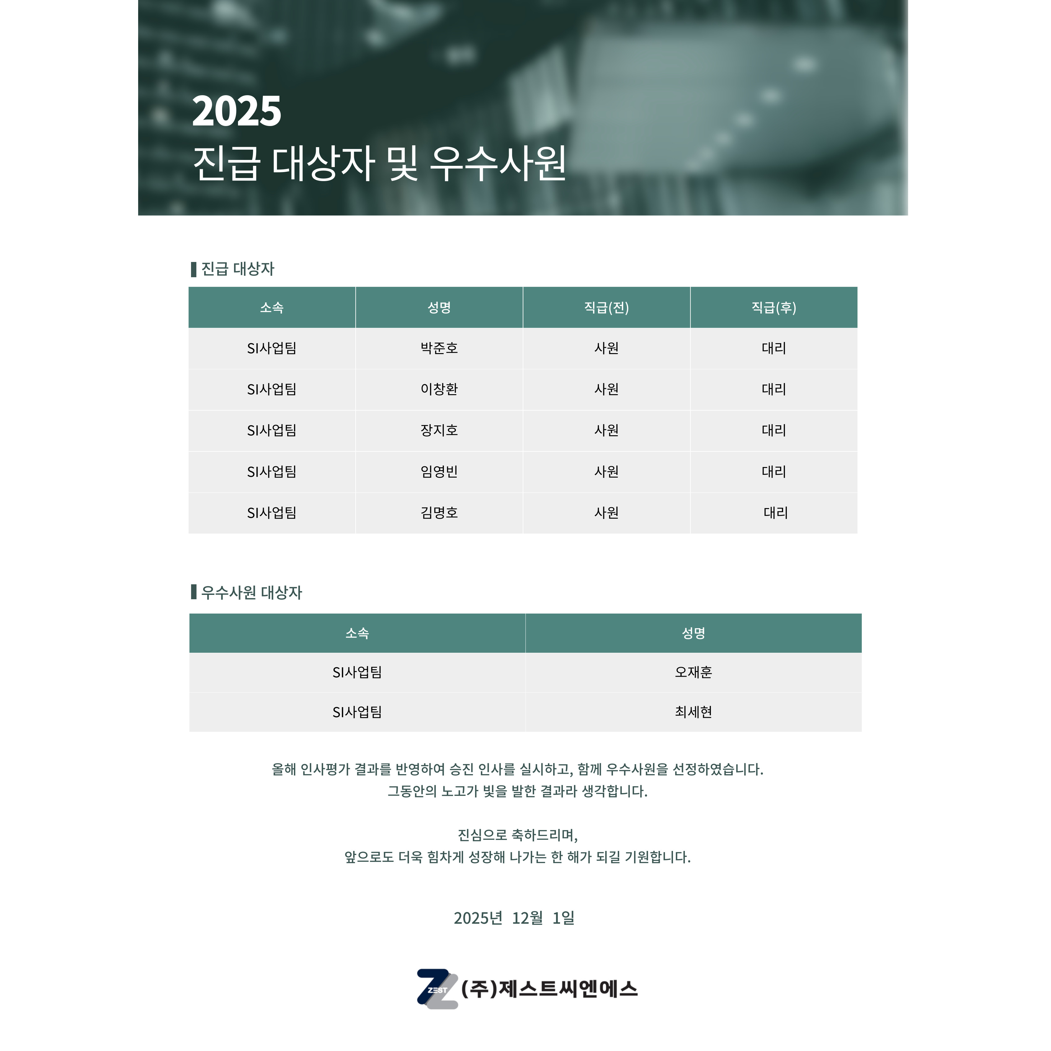 2025³âµµ ÇϹݱâ Àλç¹ß·É ¹× ¿ì¼ö»ç¿øÀÌ ¾Æ·¡¿Í °°ÀÌ °áÁ¤µÇ¾úÀ½À» ¾Ë·Áµå¸³´Ï´Ù.